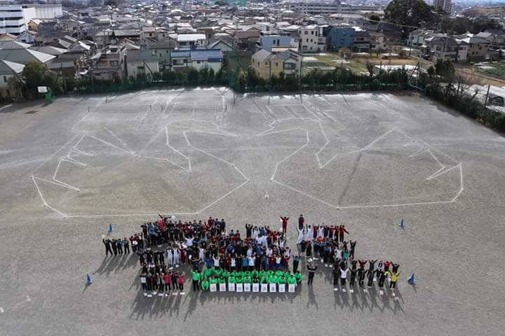 ここまで授業として実施しました。最後に校庭で地上絵をバックに記念撮影!